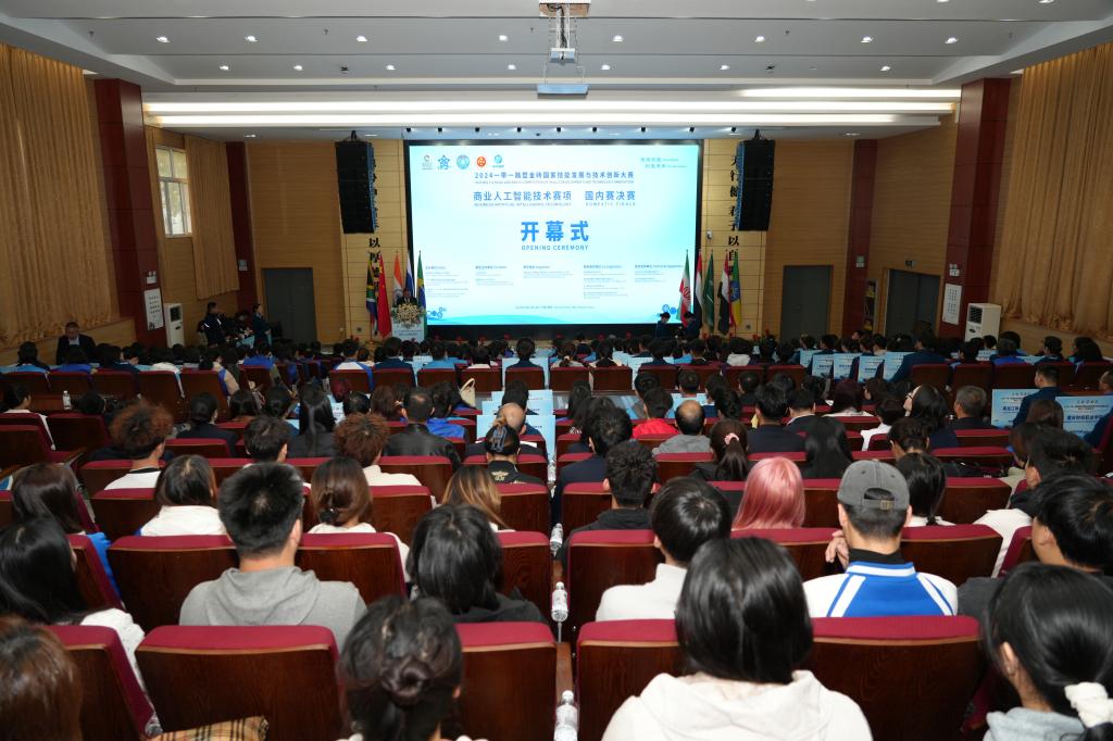 申雪峰、程书强、张云启、陈继、张小平共同按下了大赛启动手印。申雪峰宣布:“2024一带一路暨金砖国家技能发展与技术创新大赛商业人工智能技术赛项国内赛决赛正式开幕!”