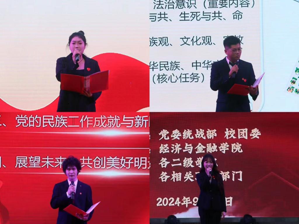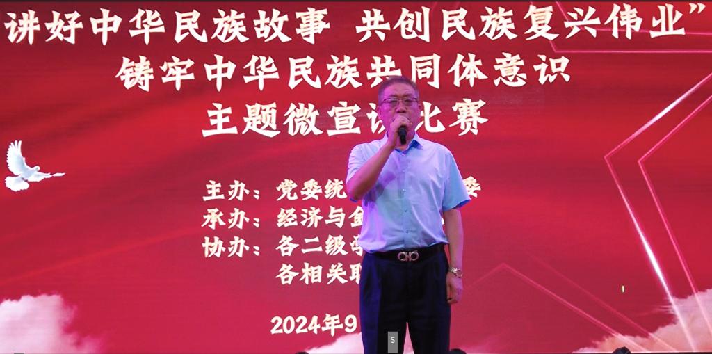 为深入贯彻落实党的二十大精神,深入学习贯彻习近平总书记关于加强和改进民族工作重要思想,教育引导我校学生牢固树立正确的中华民族历史观,树立休戚与共、荣辱与共、生死与共、命运与共的共同体理念,9月27日下午,由党委统战部、校团委主办,经济与金融学院承办的“讲好中华民族故事 共创民族复兴伟业”铸牢中华民族共同体意识主题微宣讲比赛在我校大礼堂隆重举行。党委书记高玉峰、党委副书记朱华斌、副校长雷旭、党委委员党委宣传部部长严丽丽、党委委员党委组织部部长(党委统战部部长)穆天楠、团委书记张洁、以及各二级学院党总支书记出席比赛。各二级学院团委书记、学生代表1300余人现场观赛。