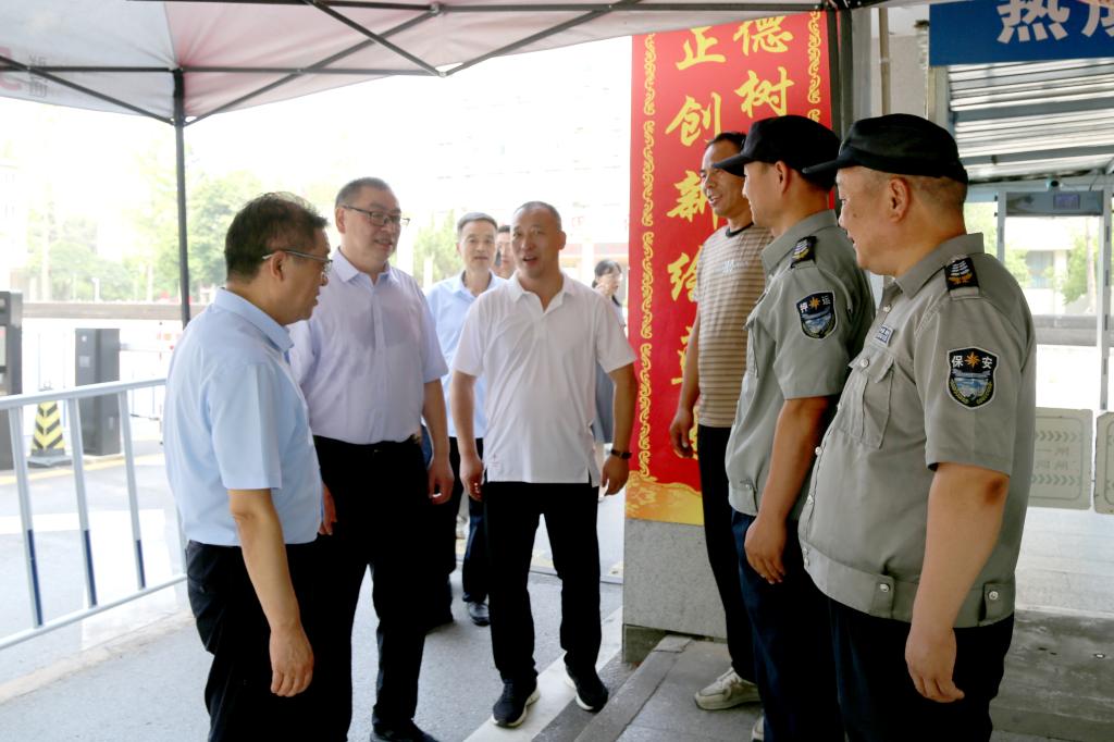 7月12日上午,学校党委书记高玉峰、校长程书强带队检查指导校园各重点部位的安全稳定工作并看望参加技能竞赛训练的师生。党委副书记朱华斌,副校长张秦龙、雷旭,以及党委组织部、党委宣传部、党政办公室、保卫处、总务处、教务处、学生工作处等部门负责人陪同检查。