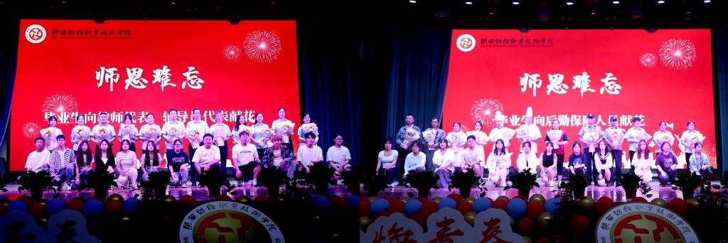 典礼上,教师、辅导员代表和后勤工作人员代表上台接受毕业生们献上的鲜花。每一束鲜花都代表着毕业生们深深的感激和敬意,每一声“谢谢”都凝聚着他们内心的感动和尊重。