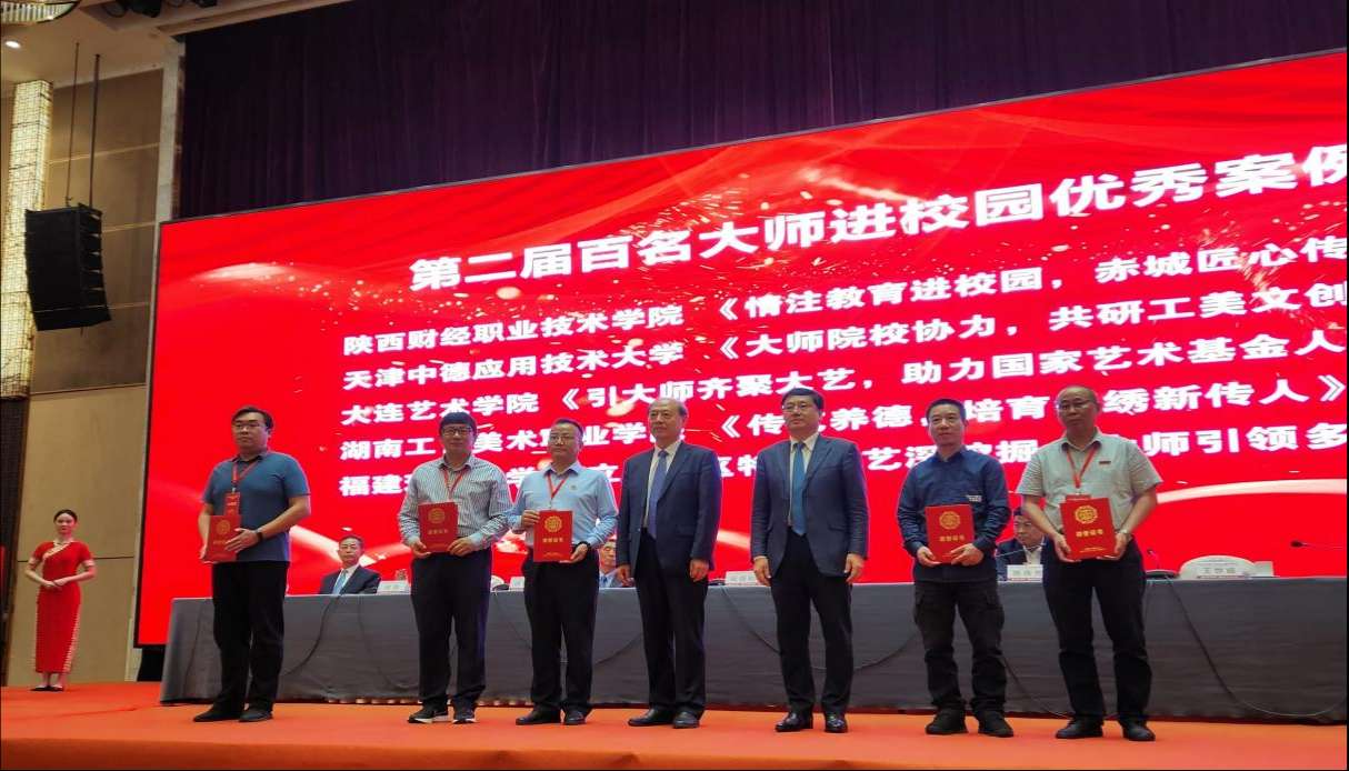 博览会开幕前,中国轻工业联合会、中国工艺美术大师工作委员会召开2024中国工艺美术大师工作会议,中国轻工业联合会会长、中国工艺美术大师工作委员会主任张崇和出席会议并作主旨报告。会上,张崇和会长高度赞扬了我校中国工艺美术大师、人文艺术学院院长贺兴文在工艺美术进校园传承非遗、以美育人方面做出的巨大成绩和取得的先进经验。我校人文艺术学院党支部书记兼副院长宋波撰写的案例《情注教育进校园,赤城匠心传技艺》荣获2023—2024年度“百名大师进校园”优秀案例,全国仅有5个学校选送的案例获奖,我校是其中之一。
