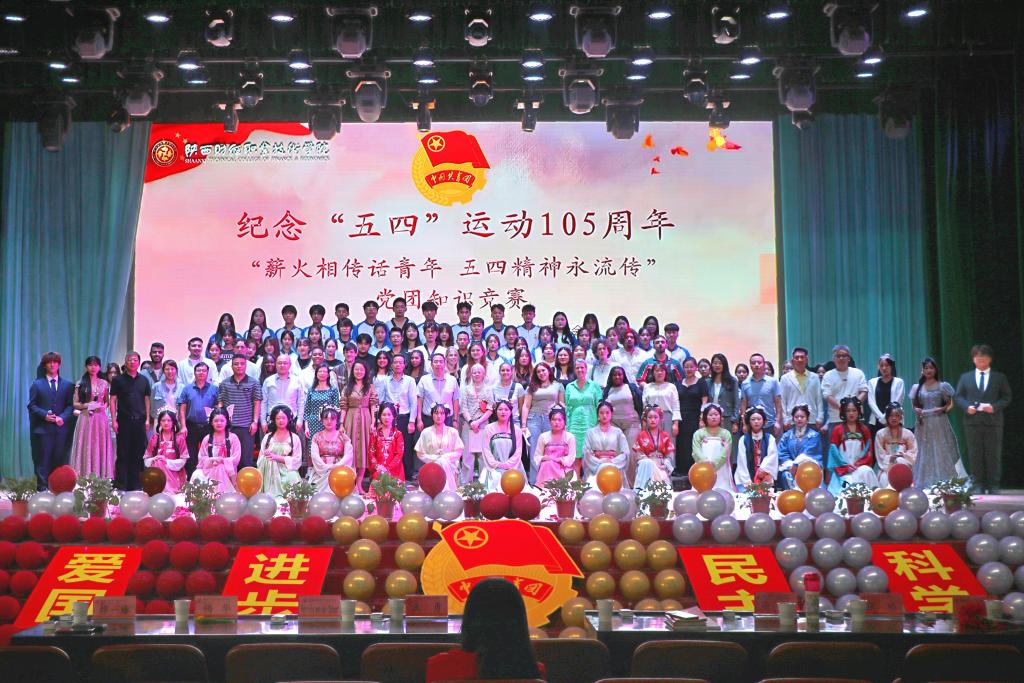 为深入学习贯彻习近平新时代中国特色社会主义思想和党的二十大精神,加强科学理论武装,引导广大青年学生学习习近平总书记五四青年节寄语,激励广大青年学子高举团旗跟党走,传承党的红色基因,凝聚奋进力量,在中国共产主义青年团成立102周年、纪念“五四运动”105周年之际,由校团委主办、全北学院承办,各二级学院团组织协办的“薪火相传话青年 五四精神永流传” 党团知识竞赛决赛于5月9日下午在学校大礼堂成功举办。