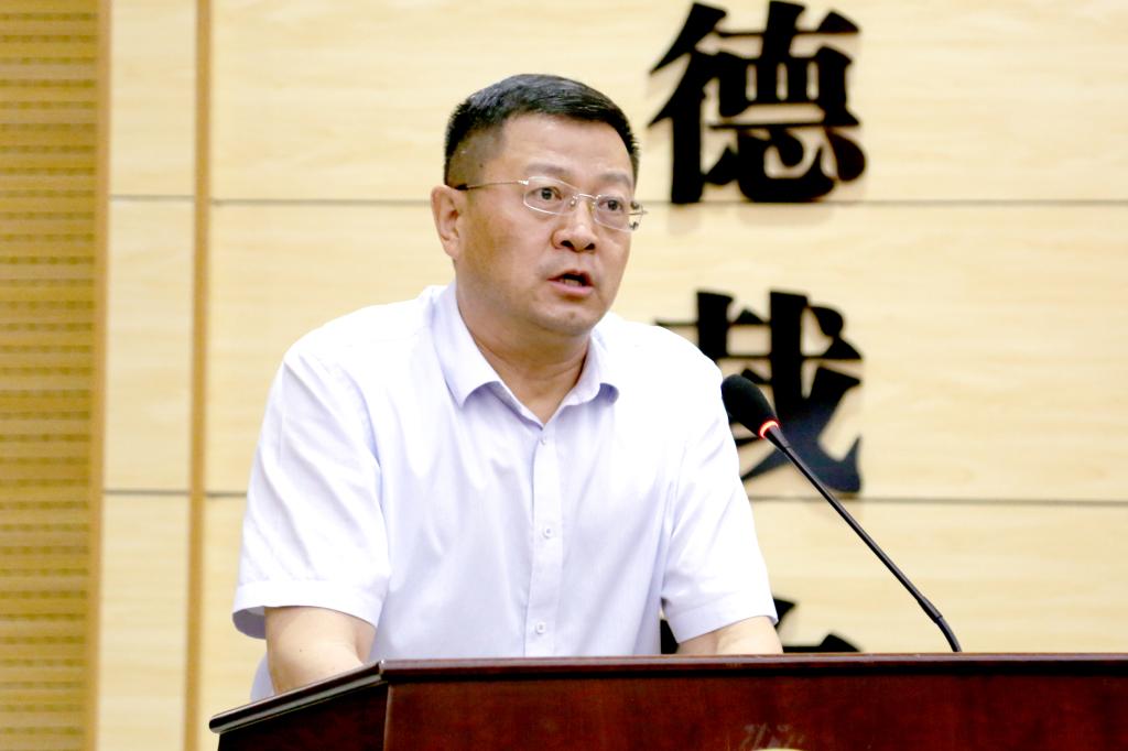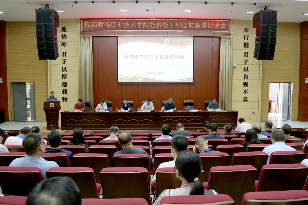 2022年6月14日下午,我校在学术报告厅召开处科级干部任前集体谈话会。学校领导班子成员、现任处级中层干部和新提拔处科级干部等70余人参加会议。院长程书强主持会议。
