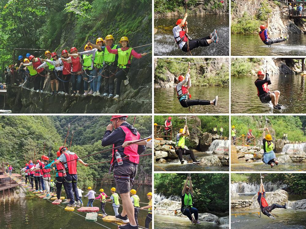 7月19日早上9时,所有队员在园区门口集合,依次穿上安全装备、戴上头盔,猛龙队、超越队正式合为一只队伍并有序进入终南山寨极限运动训练基地。拓展训练包括水上、空中、林间、岩壁等项目,许多队员还从没参加过类似训练,难免有畏难情绪,董媛、李福顺及全体党员一马当先、勇往直前,并鼓励大家超越内心的自己,建立自信心,要相信自己一定能行。队员们依次通过了浮桩独木桥、高空滑索、抽板过河、飞夺泸定桥、携手并进、荡绳过河、玻璃桥以及高空滑索等关卡,除个别同志因身体原因在旁助阵,全队百分之九十成员勇于挑战自我、超越自我,克服了重重困难,闯过了道道关卡,圆满完成了所有拓展训练项目。