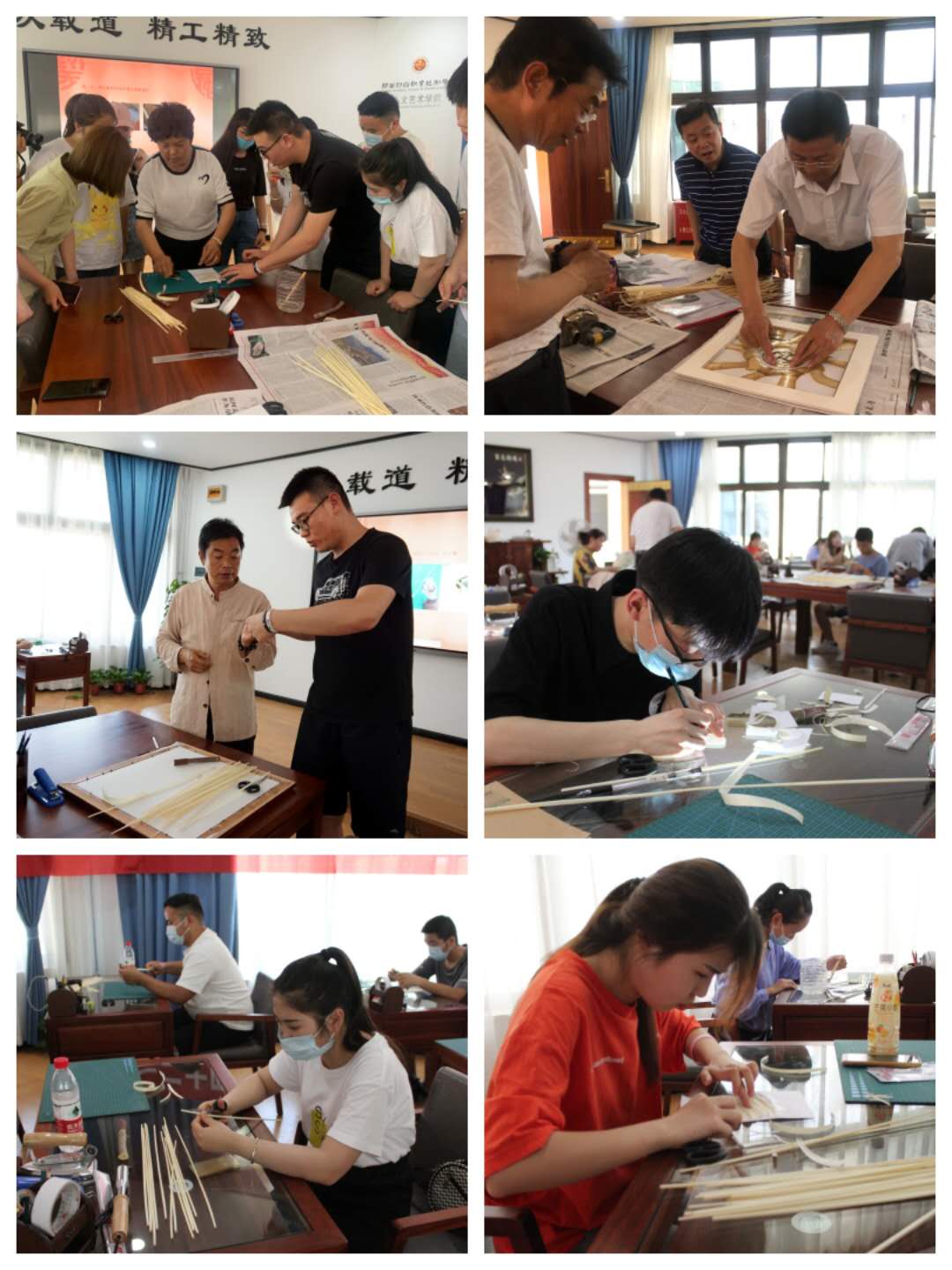 首先,中国工艺美术大师、大国工匠贺兴文向同学们讲述了非遗文化和非遗传承人的概念,介绍了非遗文化的发展历史,以及非遗文化传承的重要性。贺兴文结合自己的艺术创作经历讲述了麦秆画的基础知识、工艺流程,并展示了部分麦秆画的经典作品。同学们被一件件惟妙惟肖、精美绝伦的作品深深吸引。在贺兴文的亲自指导下,同学们现场体验做麦秆画,有的剖麦秆,有的打底图,大家相互协作,经过两个多小时的精心制作,一副由同学们亲手绘制的麦秆画《校训图》新鲜出炉。