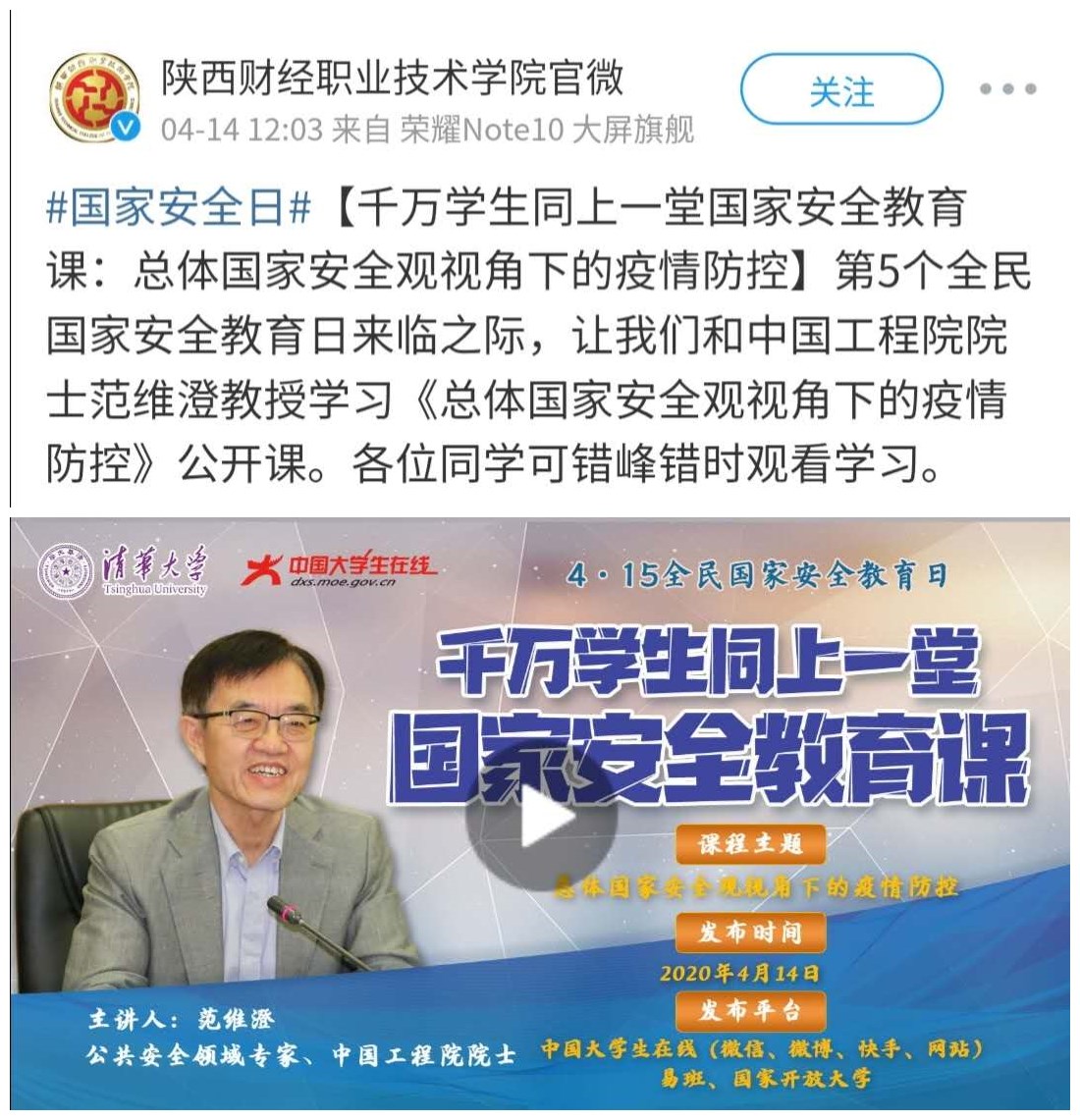 本次全民国家安全教育日宣传教育活动自4月8日起,结合当前疫情防控的形势和“停课不停学”的教学实际,学院的宣传教育活动主要采取门户网站、微博、微信等新媒体平台,并纳入疫情防控等相关内容。