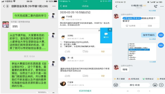 商学院注重特色教学,探索实践“一专业一策”、“一课程一策”、“一教师一策”的线上教学思路。教学计划每周安排、教学进度时时跟进,提倡课程负责人、授课教师根据专业及课程特色,为学生开设一个新颖、趣味,富有吸引力的网络课堂,充分调动学生的自觉性、主动性,提升学生参与线上教学的积极性。全体教师利用职教云、钉钉直播等平台,形成了线上教学、在线答疑、实时讨论、经验分享等多种教学方式。注重网络课堂的过程监控,对于在教学过程中发现的各种问题,及时通过微信群等平台进行交流沟通解决,努力提高教与学质量。