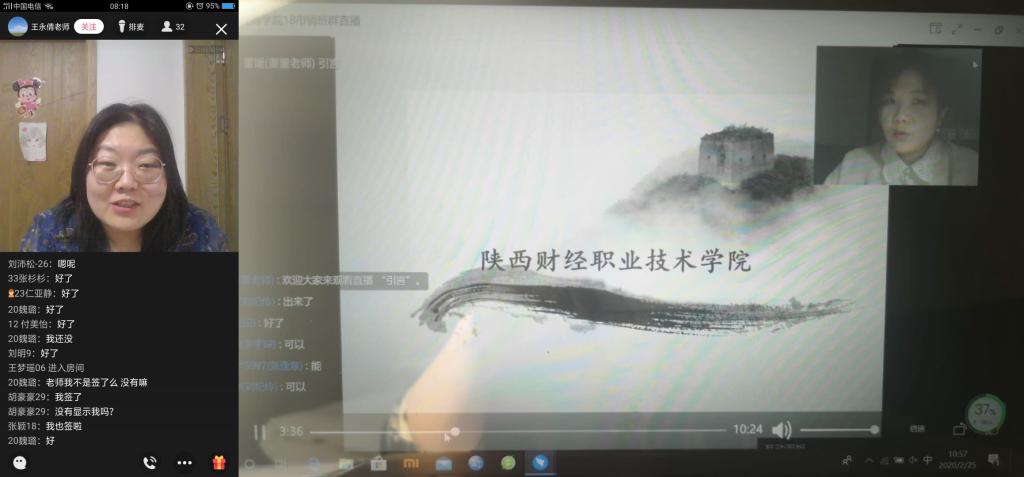 疫情防控期间,为了确保“停课不停教、停课不停学”,陕西财经职业技术学院印发了《学院疫情防控期间教学工作安排》,成立了教学工作领导小组,组织开展了教师线上教学培训。教务处组织各教学院(部)根据教学计划和教学任务制定具体线上教学实施工作方案,依托智慧职教、蓝墨云班课、超星学习通、学银在线、U校园等教学资源,运用钉钉直播、腾讯课堂、QQ视频、微信群等平台,积极打造线上“云”课堂。