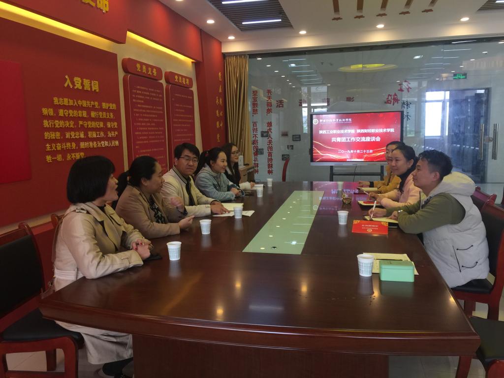 10月23日上午10:00,陕西工业职业技术学院团学干部一行5人来我院交流共青团工作。出席此次座谈会的有陕西工业职业技术学院团委书记赵双军、机械工程学院团总支书记何瑾、财经与旅游学院团总支书记杜鹃、团委干事徐翠萍、曹淼,财经旅游学院团总支干事赵盼盼,以及我院团学干部共8人。座谈会由团委书记窦曼娟主持。