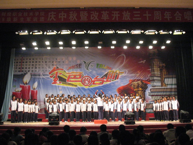 2008年9月14日晚,陕西财经职业技术学院08级新生军训团在学院大礼堂举办大型庆中秋歌咏比赛。当晚,学生处副处长雷旭同志、团委书记宋波同志以及军训团所有领导、教官、指导员、同学们近1700人出席了此次盛会。随后,军训团19支连队纷纷登台献艺,一展歌喉,以歌声歌颂祖国、赞美祖国。本次比赛评出歌咏比赛优胜连6个,包括一等奖连队一个,二等奖连队两个,三等奖连队三个。最后代表学院领导关怀的月饼伴着悠扬的进行曲,纷纷发到了同学们的手中,军训团政委王铁练同志以及军训团参谋长朱俊锋同志的即兴演唱将大会推向了高潮,同学们都表示这个中秋节是最难忘、最快乐也最有意义的一个中秋节,因为这个中秋节让他们感受到了陕财职院这个大家庭的温暖和关爱。