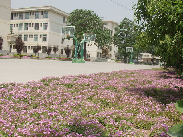 楼与楼之间到处是开满紫红色的小花,其实它的真名叫杂绛草,遇见阳光开得格外茂盛。校园里建有曲径廊架被绿藤缠绕,但见学生经常手捧书本,或默默自学,或热烈讨论,人与环境显得十分和谐美好。行道绿树成荫,围墙被紫藤爬墙虎覆盖。校园里还有一个棕榈园与桃杏树木观赏园,可谓园中之园。还有一块造型大气的大石被鲜花与绿茵所环抱,使这里人文景观有了动感。