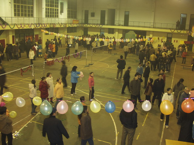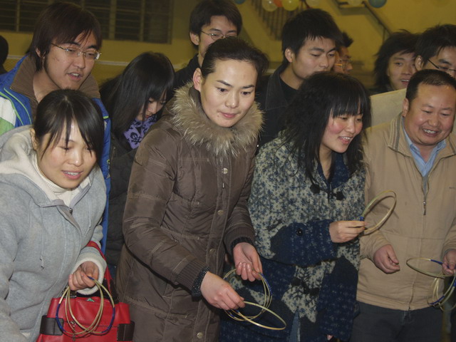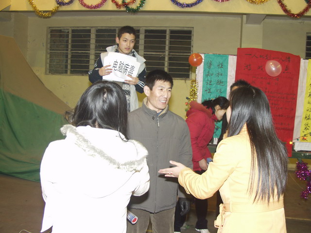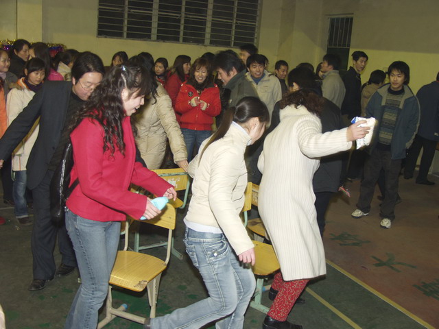 最热闹的可能要算“我来比画,你来猜”的活动现场了。也许是受央视“幸运52”的影响,组成对的教职工纷纷上场,一个比画,一个猜,一些奇怪的比画和怪异的回答,惹得观众蹊啼笑皆非,如马冀老师在给搭档比画“斑马”时,急中生智说:“我是身上有许多斑斑点点的动物”,搭档应声说“斑马”,周围刹那发出哄堂大笑。其次要数“枪凳子”现场了,这是一个锻炼反映、考验耐力和心智的活动。10人一组,在锣声中围着9把凳子转圈,锣声一落,开始枪坐凳子,没有抢到的就淘汰出局,依次递减凳子,重新开始,直到抢到最后一把凳子者胜出。一个回合下来,很多人已经大汗淋漓,既愉悦了心情又锻炼了身体。不少退休的职工也乘兴参加了活动,在“夜寻宝岛”现场,他们被蒙上眼睛,用磁铁块去粘贴数米外的地图上的台湾岛,有的粘贴得惊人准确,有的则相差甚远,甚至粘贴到了境外,逗得旁人大笑不已,整个现场充满了祥和喜庆的气氛。不少职工说,好久没有这样热闹和开心地迎新年了。