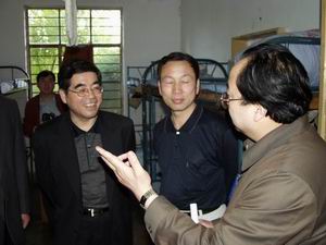 下午5时,吕明凯一行先后检查了校园环境卫生、卫生所发热门诊、学生公寓宿舍、学生食堂等重点部位,并听取了舒煜关于“非典”防治准备工作和具体措施的汇报。吕明凯在检查公寓时,与几位女同学进行了交流,询问如果有同学出现发热情况后应如何对策,女同学们都能按照学院制定的预案中的要求一一答复。