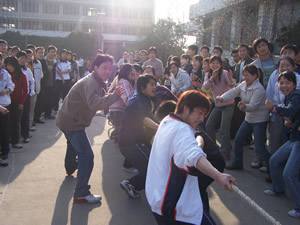 下午4时许,学院教学楼前,锣鼓阵阵,人声鼎沸,热闹非凡,庆祝活动开始举行。在学生会干部的组织下,拔河比赛有序进行,53个班级男、女同学组队,依此参加比赛。参赛的同学精神抖擞,劲头十足,旁观的同学摩拳擦掌,跃跃欲试。在锣鼓和拉拉队员的呐喊助威下比赛激烈进行。特别是女同学们斗志昂扬,巾帼不让须眉,团结协作,表现出了顽强拼搏精神。拔河比赛使同学们亲身体会了“团结就是力量”的真正含义,培养了团结协作精神,增强了集体荣誉感。