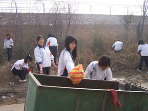 这次活动由院团委负责人宋波带队。9时整,全体团员青年志愿者身着校服,打着校旗,臂戴志愿袖章,在教学楼前集合,开赴到学校东门外开展活动。同学们推着垃圾车,提着塑料袋,沿路边苗圃,将一个个果皮、纸团、食品包装等垃圾拾入塑料袋,装上垃圾车,运往垃圾场,弄得满脚是泥,浑身是灰,没有怨言。一个小时后,学院家属区东侧主干通道被清理得干干净净。随后,他们又到文林公园捡拾垃圾,擦洗栏杆,清理枯枝,使公园面貌整洁一新。