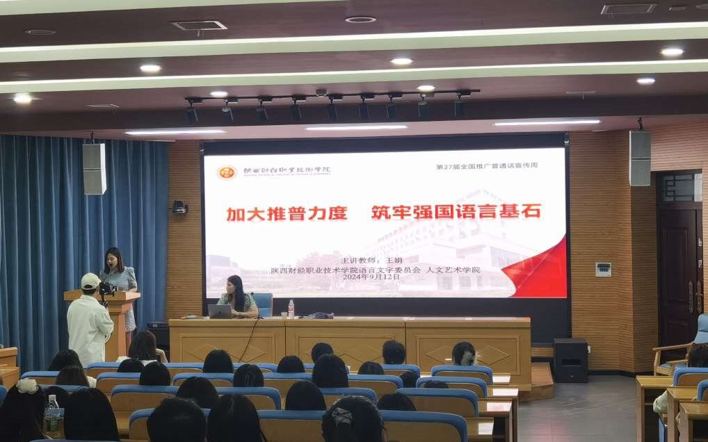 为了积极做好学校语言文字工作,依据《陕西财经职业技术学院关于开展第27 届全国推广普通话宣传周活动的通知》安排,9月12日晚上7点,学校语言文字委员会、人文艺术学院在继续教育报告厅联合举办了“加大推普力度,筑牢强国语言基石”主题讲座。讲座由人文艺术学院艺术系美育教研室主任候清睿主持,艺术系副教授王娟主讲,学校全体美育教师参加了此次活动。