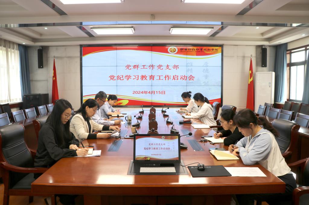 4月15日下午,党群工作党支部在四楼会议室召开党纪学习教育工作启动会,认真学习习近平总书记关于全面加强党的纪律建设的重要讲话重要指示精神,传达学习中央党的建设工作领导小组、省委党的建设工作领导小组会议、学校党委研究部署党纪学习教育工作会议精神,并对党群工作党支部提出学习要求。党群工作党支部全体党员参加。支部书记穆天楠主持。
