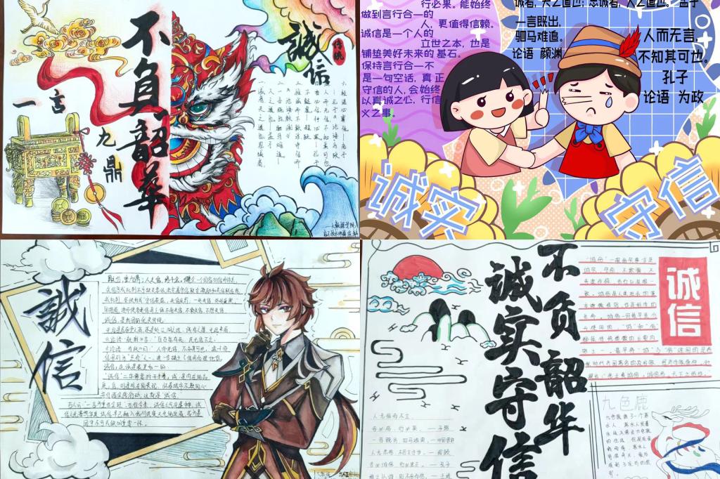 ——“诚实守信,不负韶华”海报、手抄报比赛。感恩奉献,励志成才。大数据与人工智能学院结合学生专业特点,开展了以“诚实守信,不负韶华”为主题的海报、手抄报征集活动,通过学院官微宣传资助诚信作品,将“诚信感恩”理念贯彻到每一位学子的道德思想当中,引导学生深入思考诚信内涵,剖析在时代背景下诚信品质的重要意义,传播诚信正能量。