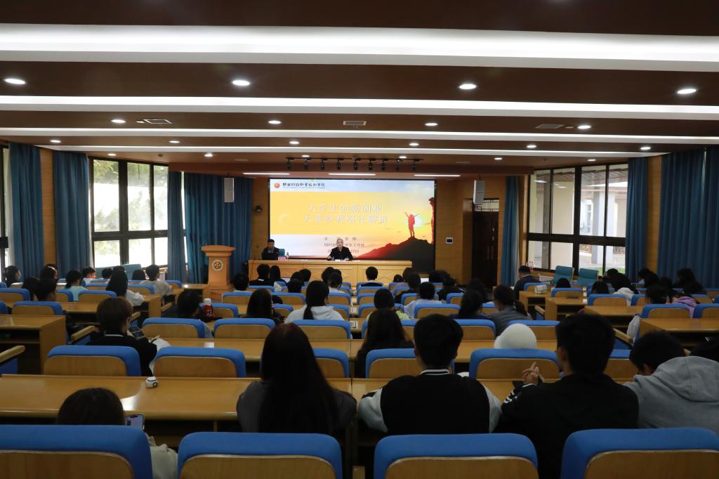 在学术报告厅经济与金融学院的“经金就业创业联盟”成立暨首届“大创与生涯规划活动月启动仪式上,学生工作处副处长王刚作为首批聘任的校内就业创业导师、创新创业省赛评委为参会师生作了职教赛道专题解读。