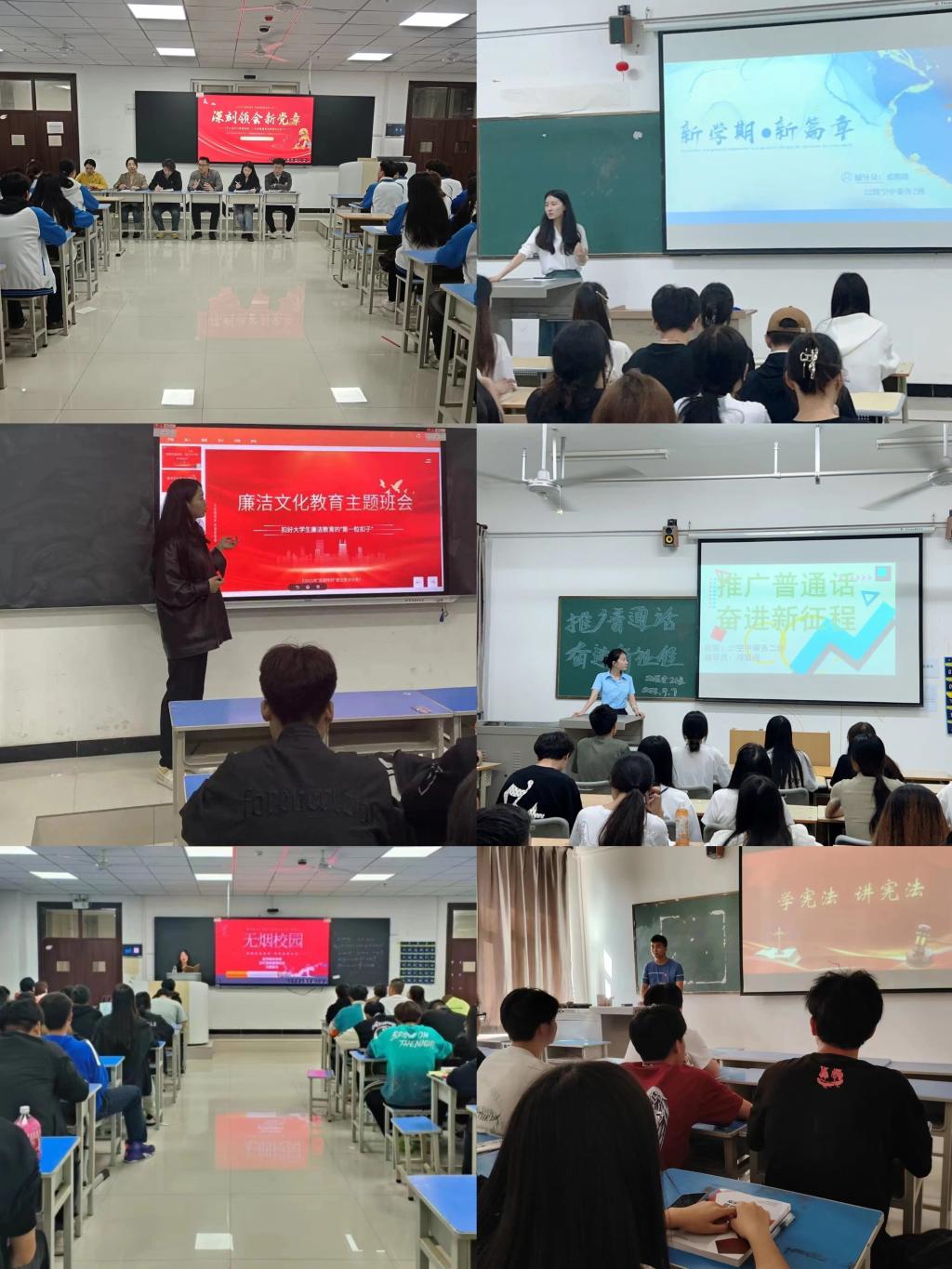 为进一步营造育人环境,巩固“厚德育人”工程成果,我院开展学风建设系列教育活动,主要围绕“学宪法、讲宪法”、“推广普通话、奋进新征程”、“开学第一课”、“廉洁教育”、“无烟校园”等主题,深层次对学生进行思想教育,敦促学生加强品德修养、增强综合素质、提升知识见识、做事落实落细;引导学生牢固树立底线思维和红线意识,提升防范能力,全方位多角度为学生学习与成长保驾护航。