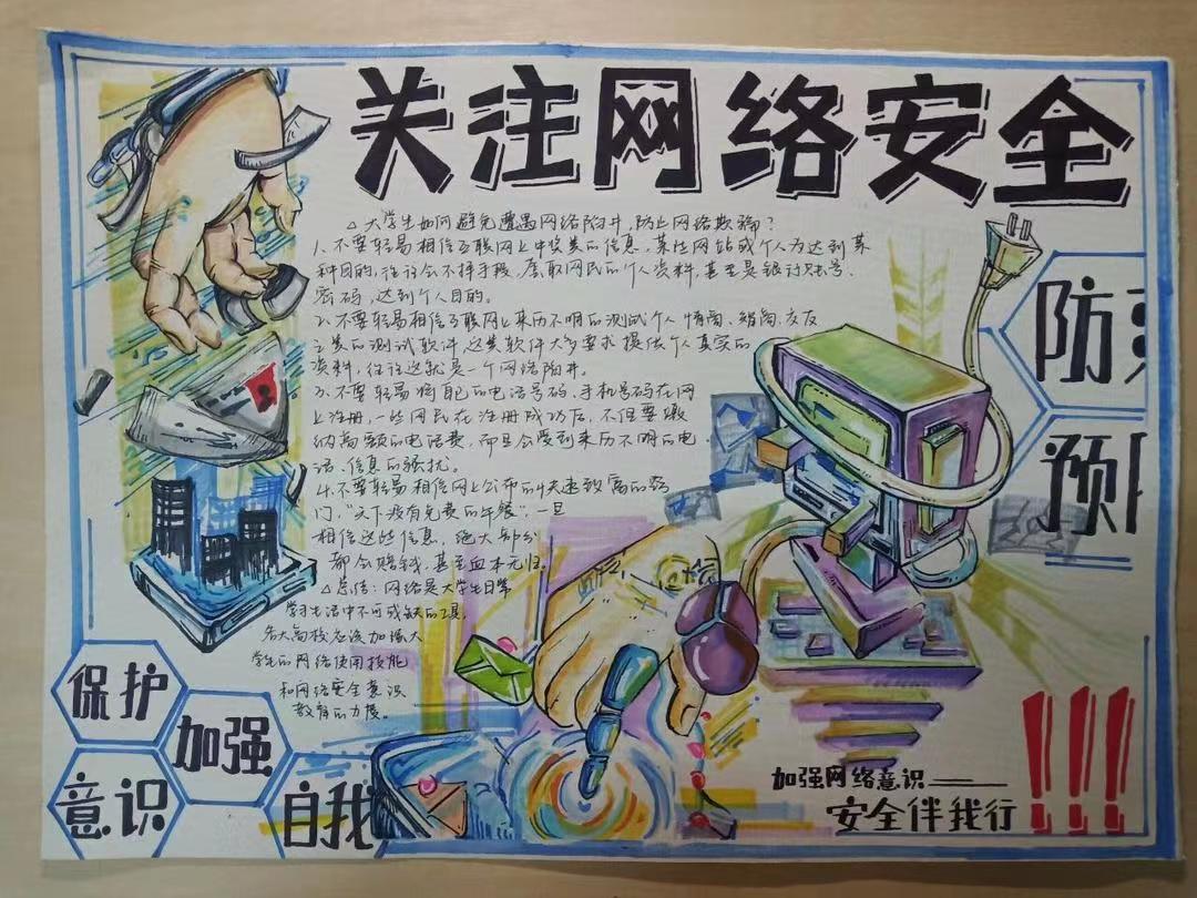 举办网络安全手抄报比赛。9月12日至16日紧紧围绕“网络安全为人民,网络安全靠人民”主题开展手抄报比赛。同学们纷纷拿起画笔,用文字和图画结合的方式,绘制出一幅幅精美的手抄报。每一幅作品主题鲜明、内容丰富、形式新颖,重点围绕保护个人信息安全、防网络诈骗、电信诈骗、健康上网等内容,传播安全上网、文明上网、科学上网理念,争做网络文明建设的倡导者、拥护者和践行者。