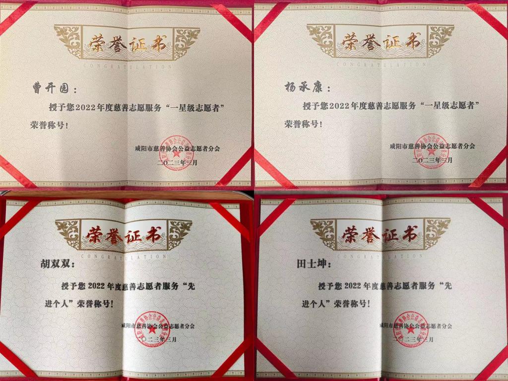 近日,咸阳市慈善协会公益志愿者分会对全市各单位2022年度志愿服务工作进行表彰,我校星梦文艺发展中心服务队、红十字会服务队荣获“先进集体”荣誉称号;我校田士坤、胡双双荣获“先进个人”荣誉称号;杨承康、曹开圆荣获“星级志愿者”荣誉称号。