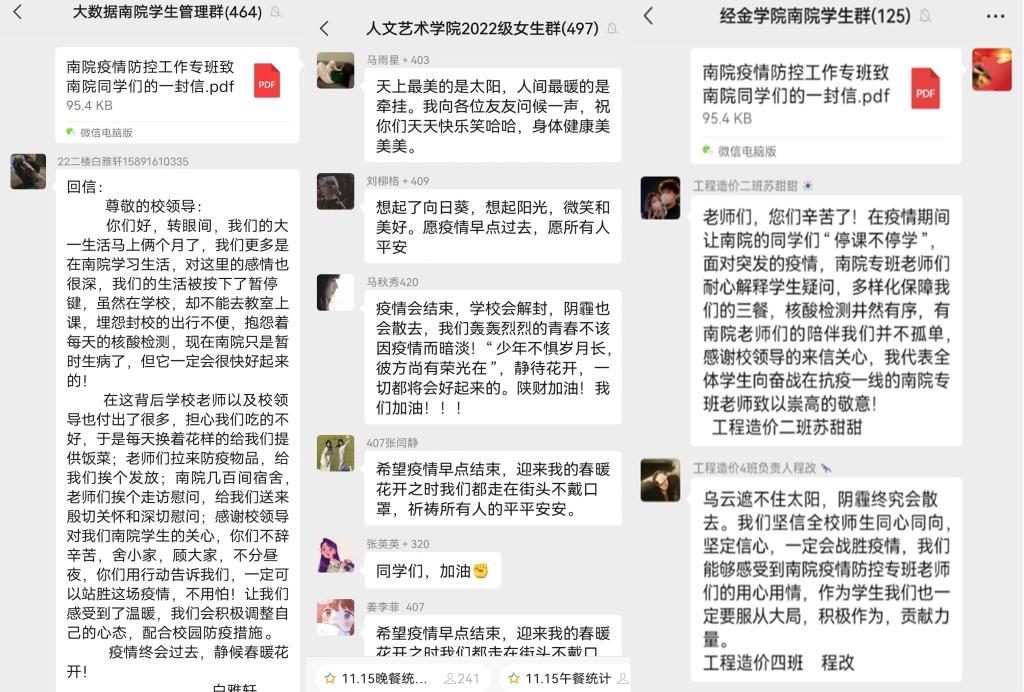 在特殊时期,撰写《南院疫情防控工作专班致南院学生的一封信》,各楼长层长分别将书信转发至楼层微信群,以致信的方式传达了学校党委和校领导的关怀与期望,勉励同学们面对疫情要“心怀大局、坚定信心,慎独自律、勇于面对”。在收到书信后,广大南院学子备受鼓舞,内心充满了感激之情,纷纷回应感受到了张志华书记和程书强院长的牵挂和期盼,也看到了南院老师们与我们同吃同住的坚守,同心同德的战斗,用实际行动践行誓言、用真情真意守护学生。南院学子也用实际行动进行了回信,从自身做起,服从学院疫情防控管理,自觉接受核酸检测安排,按时完成健康打卡、数据填报,听从命令、齐心协力、众志成城,与南院的老师们双向奔赴共克时艰。南院学子的信任与配合,是陕财学子“心怀大局、坚定信心,慎独自律、勇于面对”共克时艰的责任担当,更是南院疫情防控工作专班配合学院打赢本轮疫情防控阻击战的最大底气与动力。