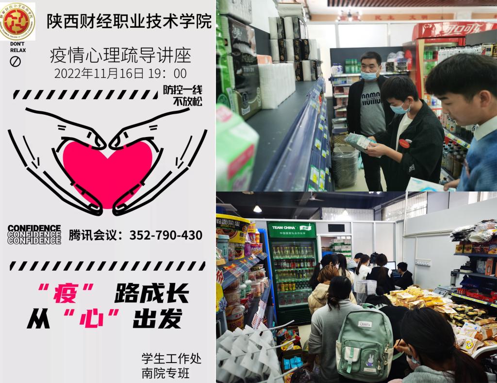 在静态管理期间,南院疫情防控专班高度重视学生的思想动态、实际需求和心理问题,想学生之所想,急学生之所急。面对复杂疫情形势所催生出的学生需求新变化,始终坚持做到在稳中应变,在变中掘新,在新中求进,牢牢掌握疫情防控中,学生管理的主动权。认真梳理疫情期间学生的实际情况,通过线上沟通交流、下沉走访宿舍等多种形式,主动了解学生的实际困难,及时回应学生的关切呼唤,坚持“学生走到哪里,管理和服务就跟到哪里”的理念,做细分类建档,做好精准施策,妥善解决南院学生洗澡问题、生活必需品和学习用品的采购问题等特殊时期的实际困难。同时与学生工作处大学生心理健康教育与咨询中心共同开展“疫”路成长,从“心”出发,线上疫情心理疏导讲座,缓解校园封闭管理带来的心理压力与情绪困扰,鼓励学生更好地调适身心、保持良好心态。
