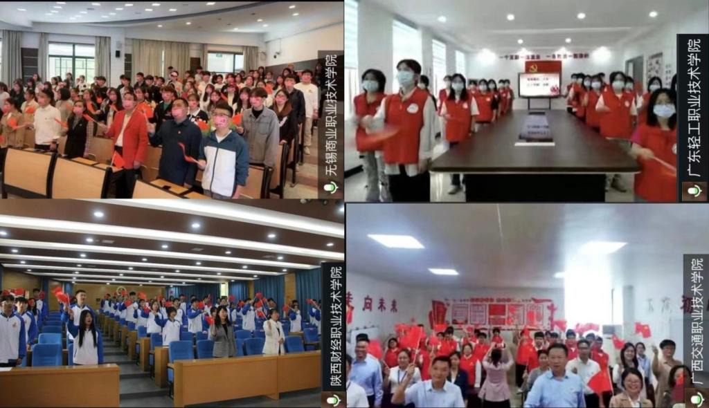 收看直播的过程中,师生满怀热忱,与全国人民一起回顾了过去五年的工作和新时代十年的伟大变革。大会结束后与会人员结合自身实际,分享学习心得,并与无锡商业职业技术学院、广东轻工职业技术学院、广西交通职业技术学院隔空举办了“青春献礼党的二十大 云上同唱一首歌”活动,四所学校的团学干部们一起合唱《歌唱祖国》,嘹亮的歌声伴着挥舞的国旗,极大地激发了广大学生的爱国主义情怀,凝聚了奋进新征程,建功新时代的强大精神力量。
