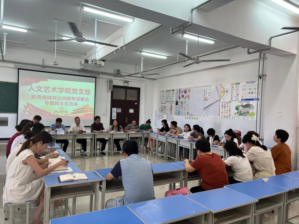 7月7日,人文艺术学院党支部在教学综合楼615教室召开教育领域突出问题专项整治专题组织生活会。全体党员参会,贺兴文院长应邀出席。会议由党支部书记宋波主持。