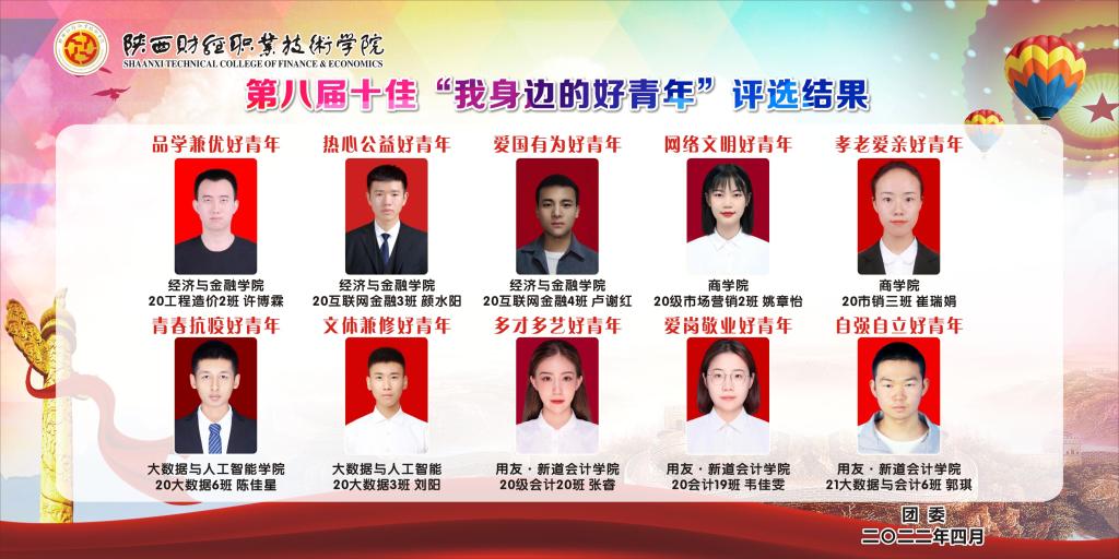 本次评选活动分为三个阶段进行:第一阶段由各二级学院、校学生会、学生社团在全院近万名学生中推荐入围人选。第二阶段是网络投票,全院学生公开微信投票,持续三天时间。第三阶段是由团委、各二级学院团总支组成的评审团进行综合评议。经过严格的审核并公示,最终授予用友·新道会计学院郭琪-“自强自立好青年”、韦佳雯-“爱岗敬业好青年”、张睿-“多才多艺好青年”,大数据与人工智能学院陈佳星-”青春抗疫好青年”、刘阳-”文体兼修好青年”,商学院崔瑞娟-“孝老爱亲好青年”、姚章怡-“网络文明好青年,经济与金融学院许博霖-“品学兼优好青年”、卢谢红-“爱国有为好青年”、颜水阳-“热心公益好青年”。