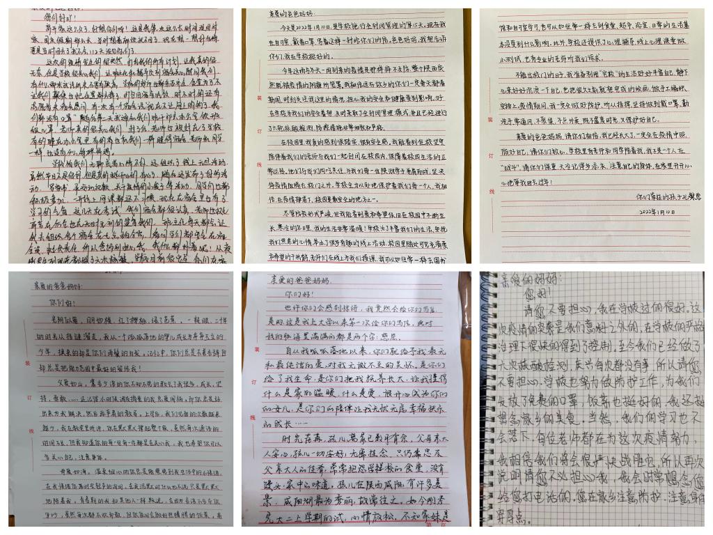 同学们通过手写家书传递浓浓的亲情,表达对父母的爱与感恩,化解千里之外家人的思念和牵挂。用友·新道会计学院学生周怡杉在信中提到“爸爸妈妈,我在学校非常好。超市东西齐全,饭堂饭菜可口,老师和我们同吃同住,学校全力以赴地保护着我们每一个人,请你们放心!”“老爸老妈,我在学校和一群优秀且可爱的老师和同学一起当防疫志愿者,在学校需要的每个角落都有儿子的身影,有时候在协助同学们做核酸检测,有时候在餐厅执勤,有时候在发放物资,累并快乐着,你们放心”校学生会轮值主席颜水阳写到。大数据学院李强兰同学告诉父母:“虽然我们封闭在宿舍,但是学习不会落下,除了复习之前掌握不牢固的知识,学校安排1月10号开始以线上授课的形式开新课,所以不必担心如果因为疫情严重而延长的留校时间中我的学习。”“亲爱的爸爸妈妈,请你们相信,我已经长大了,一定会在疫情中照顾好自己。请你们放心,学校里有老师和同学陪着我,我不是一个人在“战斗”。请你们保重,天冷要特别注意自己的身体,我爱你们!”商学院学生孔繁蓉写到。纸短情长,字字真情,句句心声。一封封书信,寄托的是真情,是祝福,是战役必胜的信心和希望!
