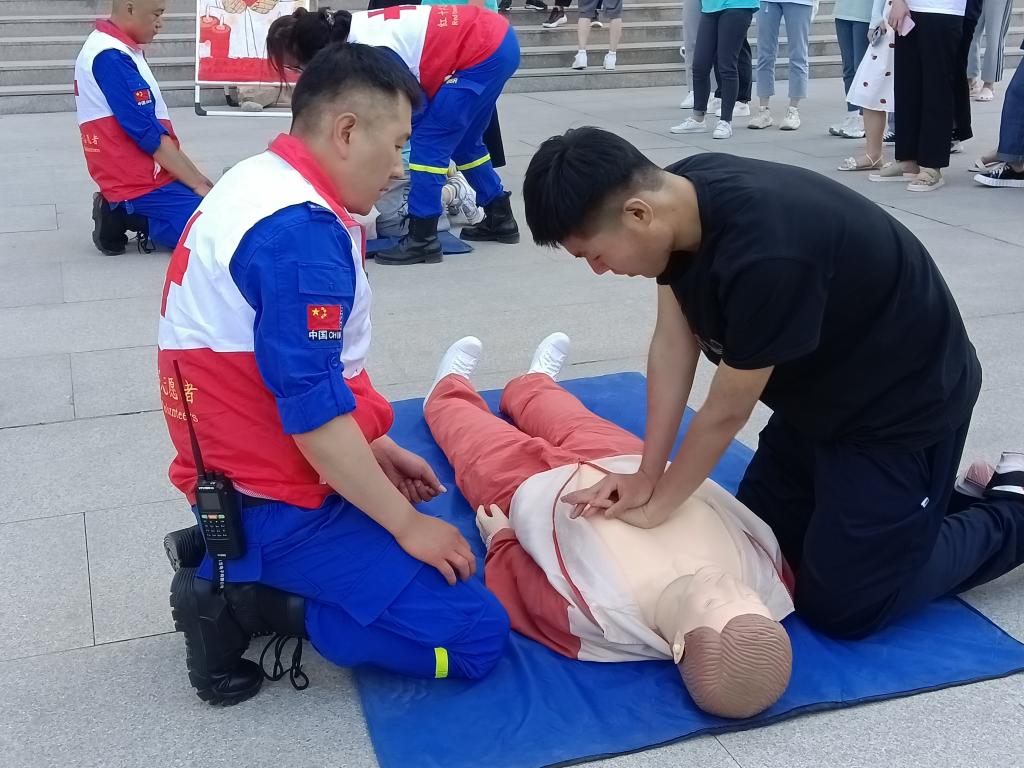 | 蓝天救援队队员现场演示急救方法 |