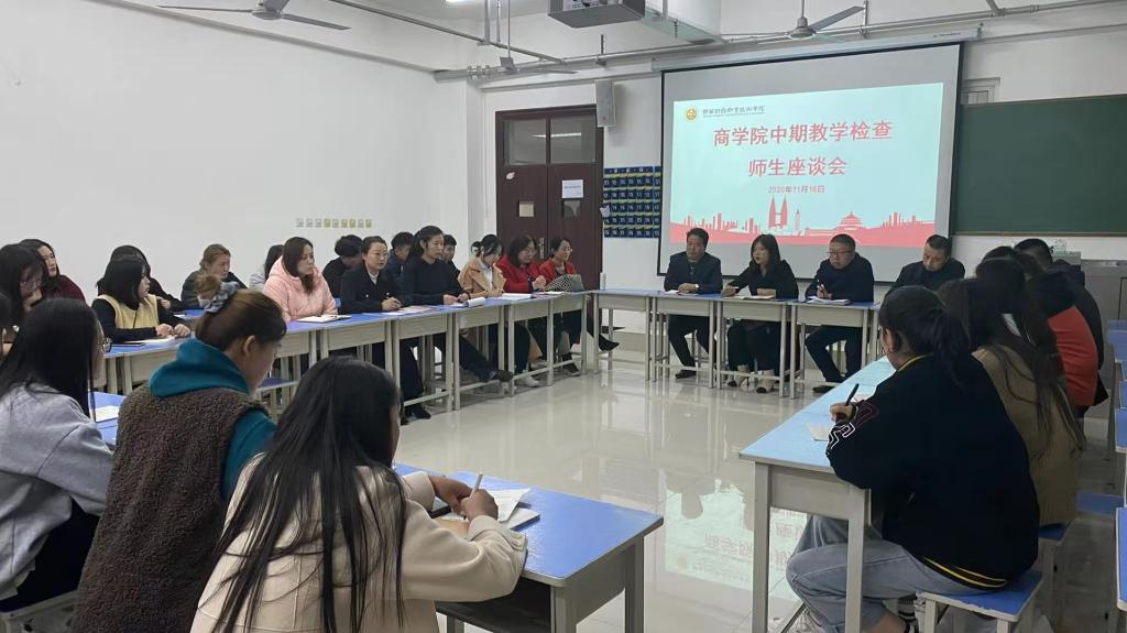 为提升教学质量,加强教学教学质量监控,商学院于11月16日下午,在615合班教室召开中期教学检查师生座谈会,商学院院长董媛,党总支书记张晓战,副院长李福顺,办公室主任窦小雨,教学科长李栋,学生科科长杨阳,团总支书记刘明,商贸流通系主任张馨予,市场营销教研室主任王福荣,物流管理教研室主任刘昙,酒店管理教研室王永倩,旅游管理教研室主任席瑶,教学秘书许潇以及商学院30余名学生代表参加了此次座谈会,会议由李福顺主持。