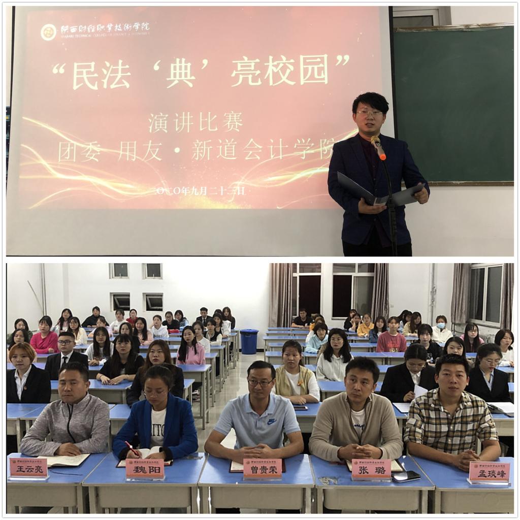 为贯彻落实中共陕西省委普法工作领导小组办公室、陕西省教育厅、陕西省司法厅关于秋季开学期间组织开展“民法典进学校”等活动的通知精神,切实加强学院师生对民法典的学习宣传教育,营造尊法、学法、守法、用法的良好校园文化氛围,由团委和用友·新道会计学院开展“让法典走进校园,让法律伴我成长”--“民法典进学校”主题系列活动。