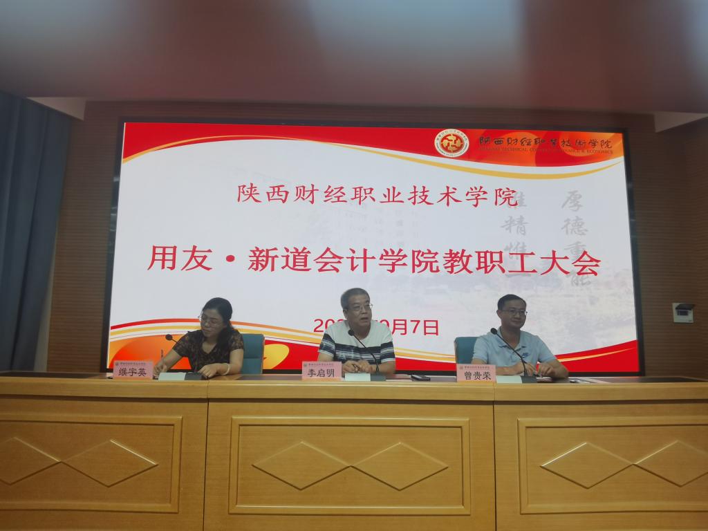 2020年9月7日下午,用友·新道会计学院在继续教育培训厅召开了学院教职工大会,这是学校院系调整后新的用友·新道会计学院召开的第一次大会,也是新学期的第一次教职工大会。会议由副院长缑宇英主持。