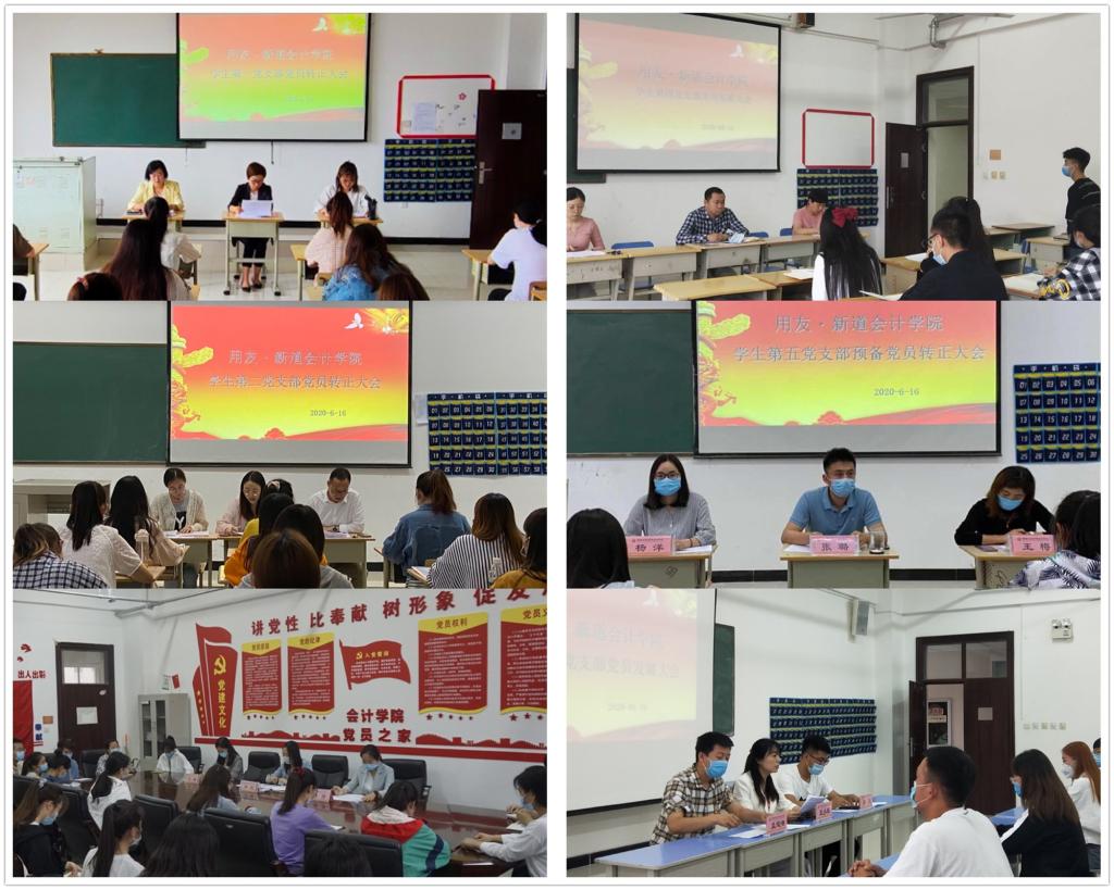 为贯彻落实学院组织部《关于学院中共预备党员发展及转正有关事项的规定》文件精神,严格遵照陕西省委组织部印发的《陕西省发展党员规程》,考虑到中组部对党员发展及转正必须线下的具体要示,结合2020年新冠肺炎疫情防控的严峻形势,以及我院疫情防控外省学生隔离检测的实际情况,经请示学院党委同意,并得到组织部门大力支持,2020年6月16日和20日,用友·新道会计学院学生党支部分别在校内外召开了2020上半年党员发展暨转正大会,旨在要把外省学生党员发展暨转正工作落到实处。