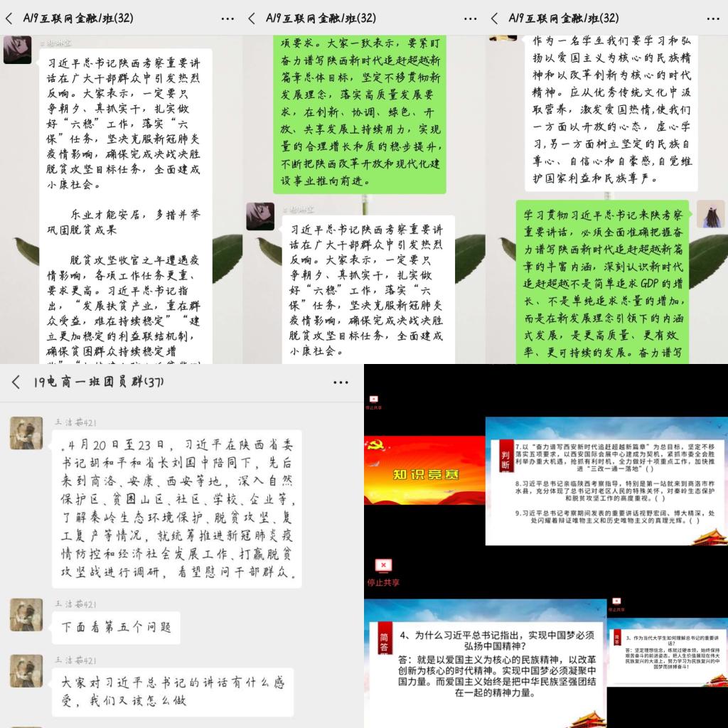 为深入学习习近平总书记来陕考察重要讲话精神,积极响应上级团组织和学院党委指示,做到团员全覆盖。5月27日,团委组织各二级学院团总支在全院青年学生中开展“学习习近平总书记来陕重要讲话精神”主题团日活动。本次活动采用线上线下相结合的方式进行,全院165个团支部组织团员青年通过班会、QQ群、微信群、腾讯会议等平台,开展了内容丰富、形式多样的主题团日活动。