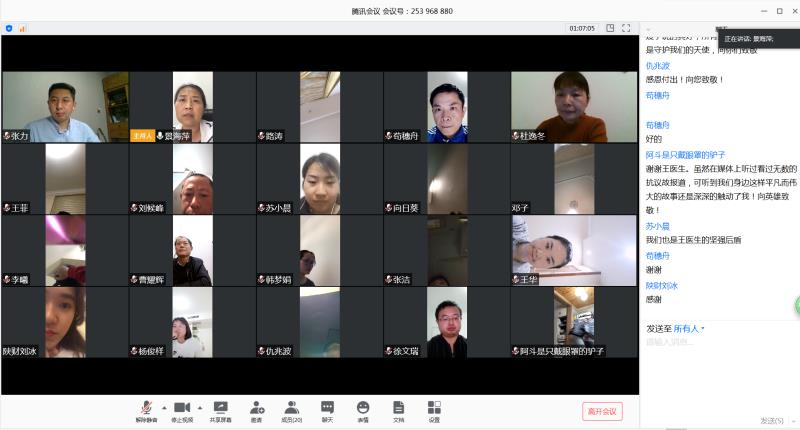 为加强抗疫期间思想教育,激励广大教工继续立足岗位,做好抗疫和育人工作。4月16日晚上,经济与金融学院在线开展了“对话援鄂医生,聆听感人故事”主题教育活动,咸阳市二一五医院援鄂医疗队队员王翠洁医生、经济与金融学院全体教师在线参加了活动。活动由经济与金融学院院长景海萍主持。晚上7点在经济与金融学院教学科长徐文瑞的介绍下,王医生准时上线。