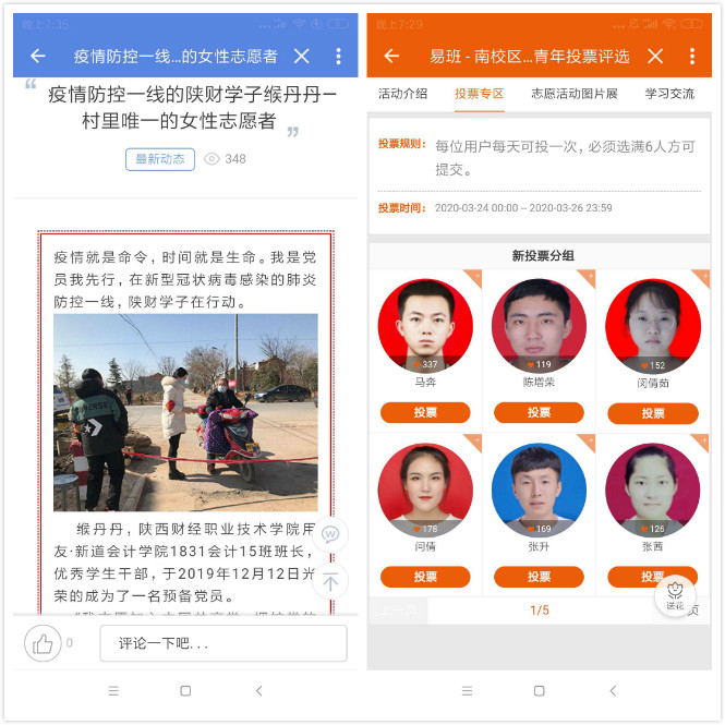 疫情就是命令,防控就是责任,新冠肺炎疫情防控工作展开后,我院青年志愿者在全国各地纷纷投入到疫情防控第一线,主动担当,积极作为,为“抗疫”献量力量,涌现出一批先进典型。为树立榜样,传递正能量,打好疫情防控阻击战,学院易班平台积极挖掘青年志愿者先进事迹,先后在易班平台宣传和推广44名学生志愿者参与疫情防控的事迹,让广大学子向先进学习、向模范看齐,积极做好疫情防控。同时,为了进一步扩大影响、树立典型,学院易班平台举行“抗疫好青年”评选活动,参与投票3810人次,页面浏览5718人次,志愿者事迹得到进一步宣传。