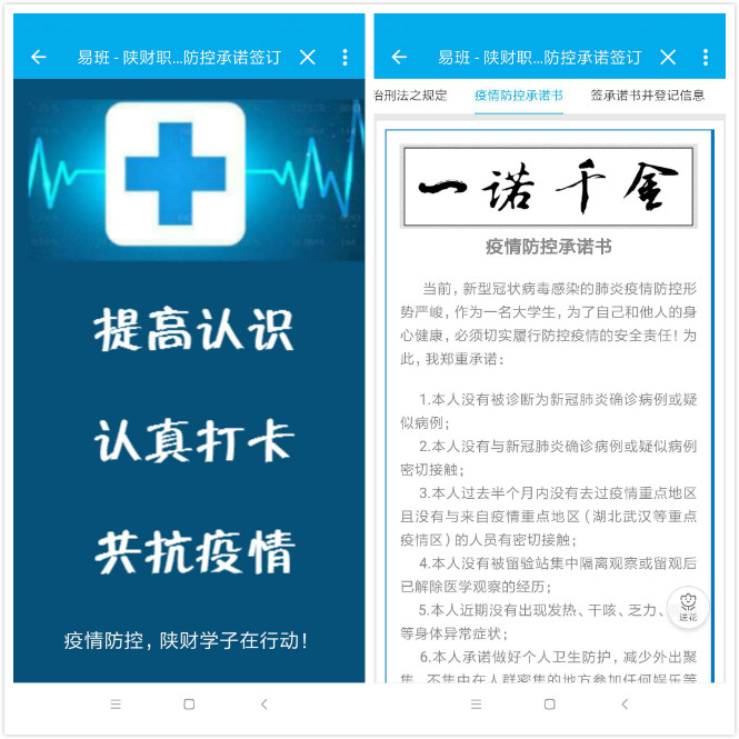 为方便学生每日上报健康信息,做好疫情摸排,学院易班平台在APP首页设置疫情摸排系统入口。同时,为督促学生如实报告身体健康信息、切实履行疫情防控安全责任,学院易班平台搭建轻应用组织学生网签疫情防控承诺书。网签指南阅读3013人次、网签页面浏览7796人次,330余名学生在评论区留言,表示坚决支持疫情摸排并认真如实做好健康信息上报,对学校负责,对自己负责。