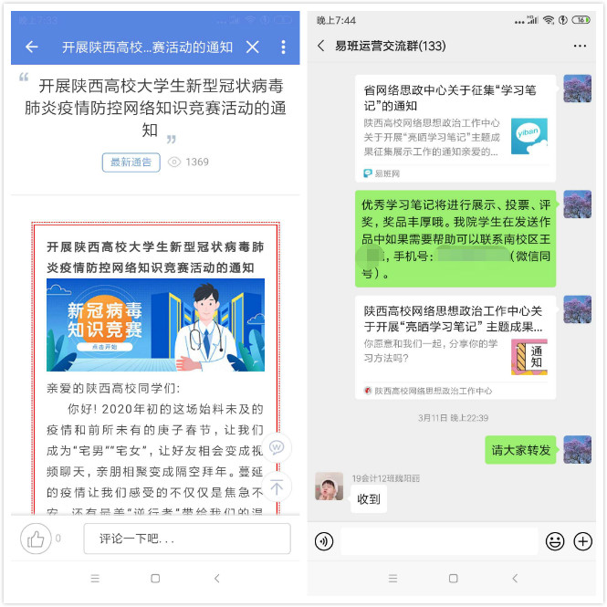 学院易班平台及时将各项疫情防控通知、致信、温馨提示及疫情防控工作动态发布推送给师生。累计发布《关于新冠肺炎疫情防控期间有关资助工作的通知》《团结拼搏战疫情,砥砺奋进迎春归——书记院长给大家回信啦!》《学院党委书记张志华、院长程书强检查督查疫情防控工作落实情况对防控工作再要求再强调》《陕西财经职业技术学院全力做好线上教学工作——停课不停学,陕财在行动》等文章81篇,阅读量达20903人次,让师生及时了解了学院疫情防控的最新情况。