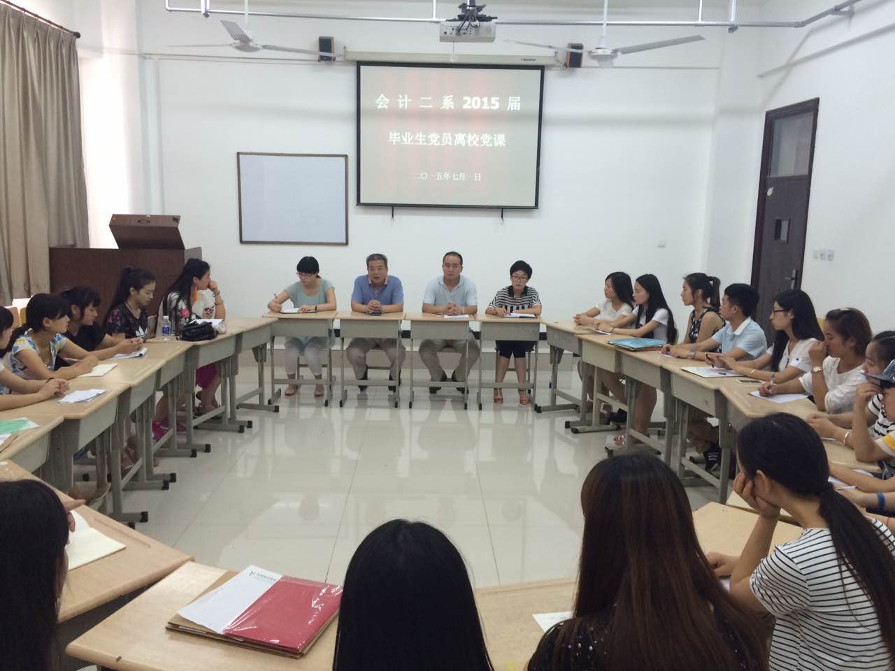 7月1日下午3时,会计二系2015届毕业生党员离校前最后一次党课在综合楼408教室举办,会计二系系总支书记李启明及毕业学生正式、预备党员共38人参加活动,会议由专职副书记乔晶策主持。