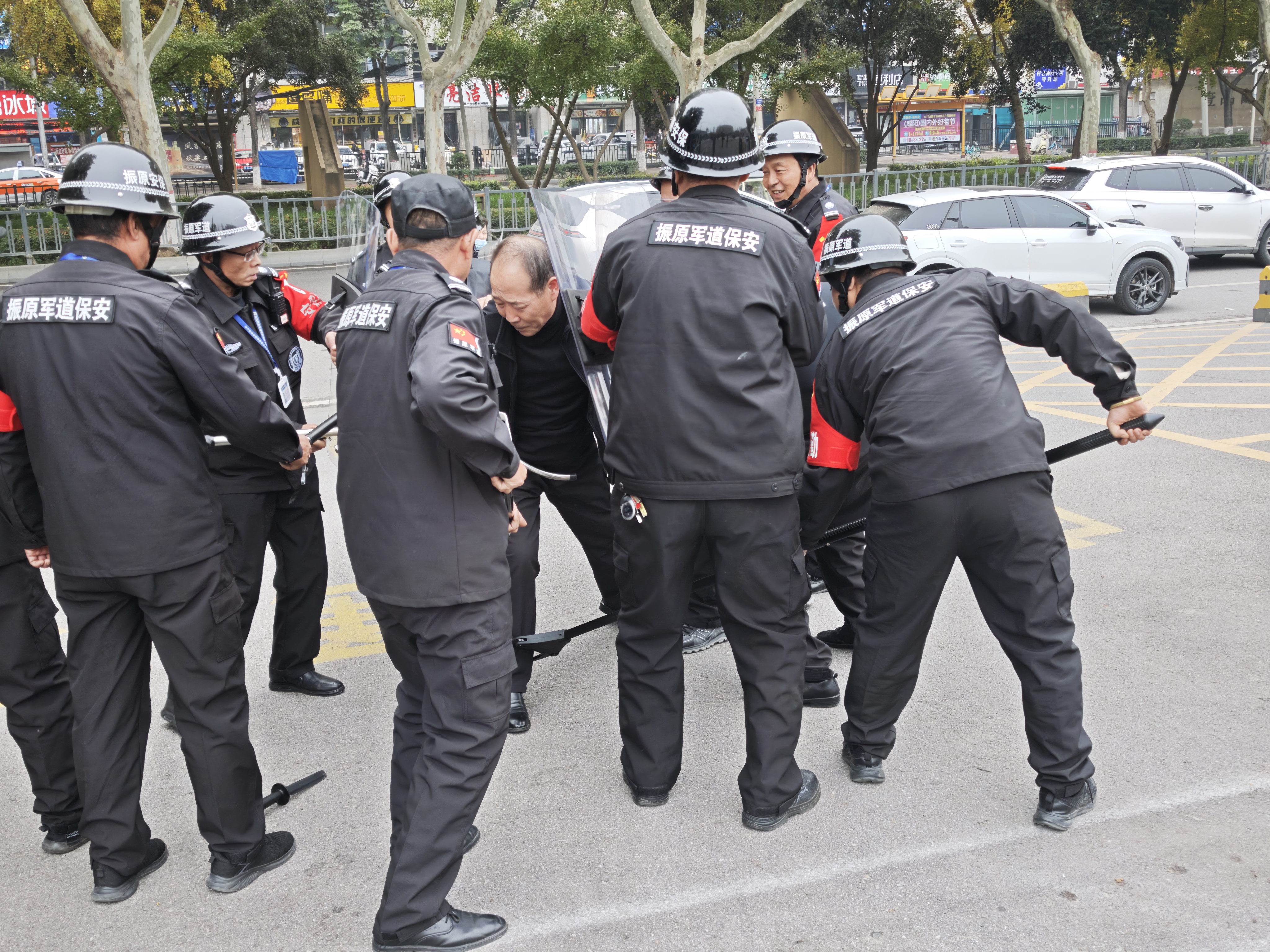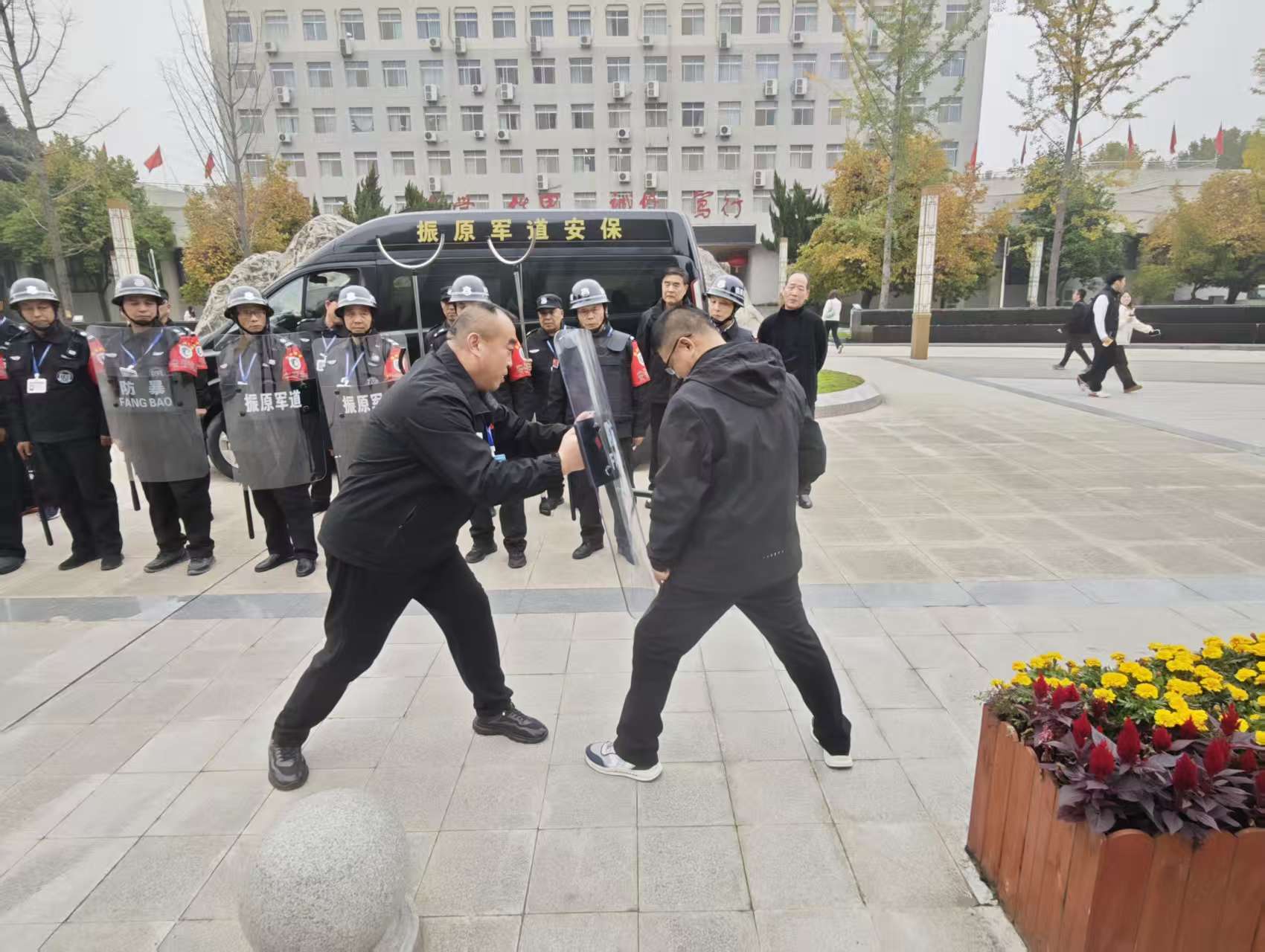 为有效防范校园暴力恐怖事件,增强保安队员突发暴恐事件的应急处置能力,保卫处于2025年10月28日下午在学校北院大门开展校园反恐防暴应急演练。