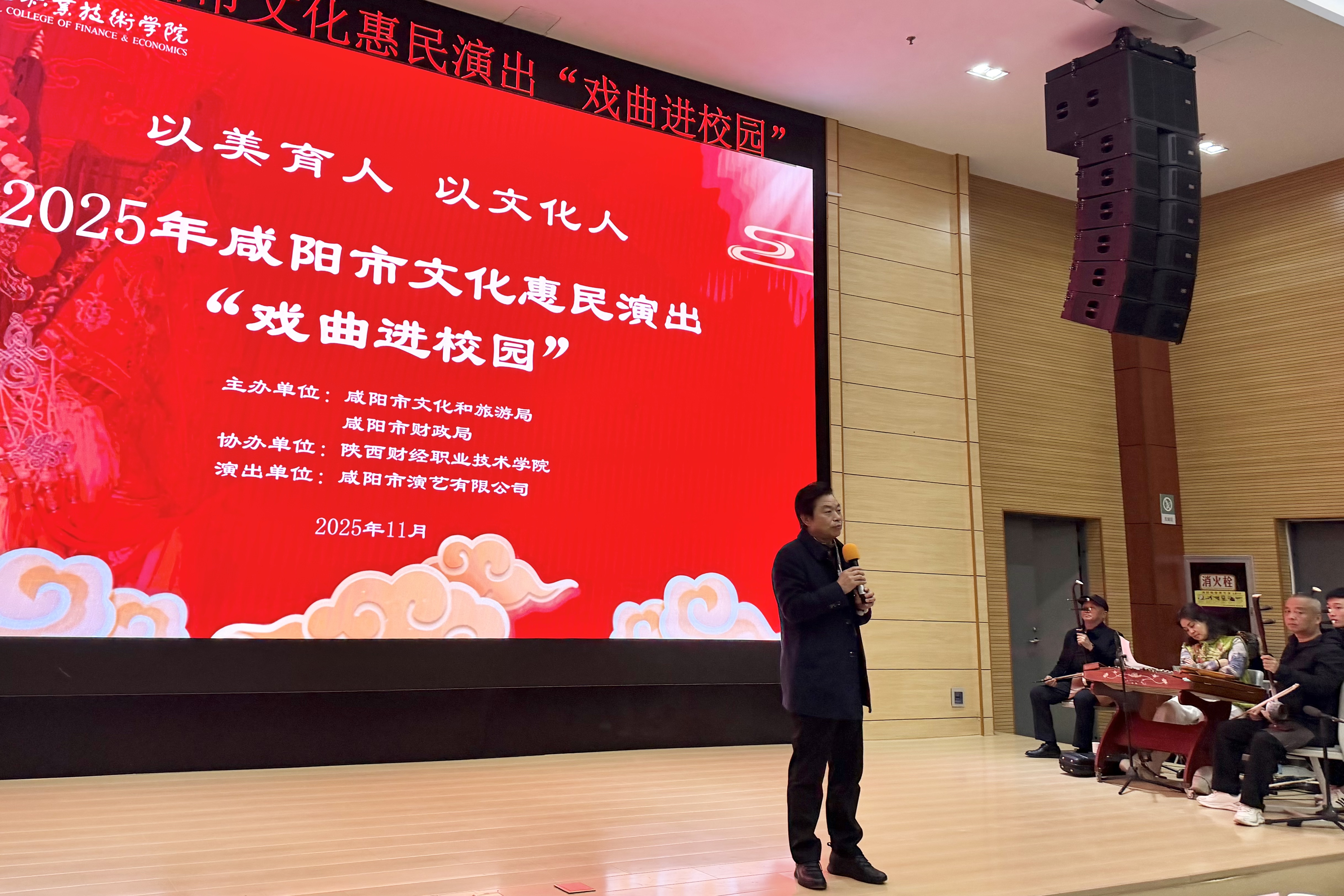 为弘扬中华优秀传统文化,深化校园美育实践,11月10日19:00,陕西财经职业技术学院“高雅艺术进校园”戏曲专场活动在学术报告厅圆满落幕。活动由学院牵头,联合咸阳市演艺有限公司共同举办,特邀咸阳市人民剧团团长、国家一级演员杨小军领衔的艺术家团队倾情献艺。学院党委委员、宣传部部长严丽丽,团委书记张洁,人文艺术学院名誉院长贺兴文等领导莅临现场,与400余名师生共赴传统艺术与美育教育交融的文化盛典