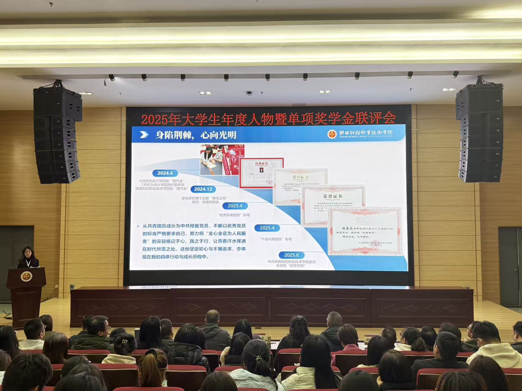 经学生个人申请、二级学院推荐和学校初评,14位学生脱颖而出,他们中有深耕专业、潜心钻研的技术能手,有扎根实践、甘于奉献的青春榜样,有自强不息、励志奋进的成长典范。他们以鲜活的事迹展现了新时代陕财学子在竞赛科研、社会服务、自强不息等多个领域的突出成就与青春担当,赢得了现场评委与观众的阵阵掌声,彰显了可亲、可学的朋辈榜样力量。