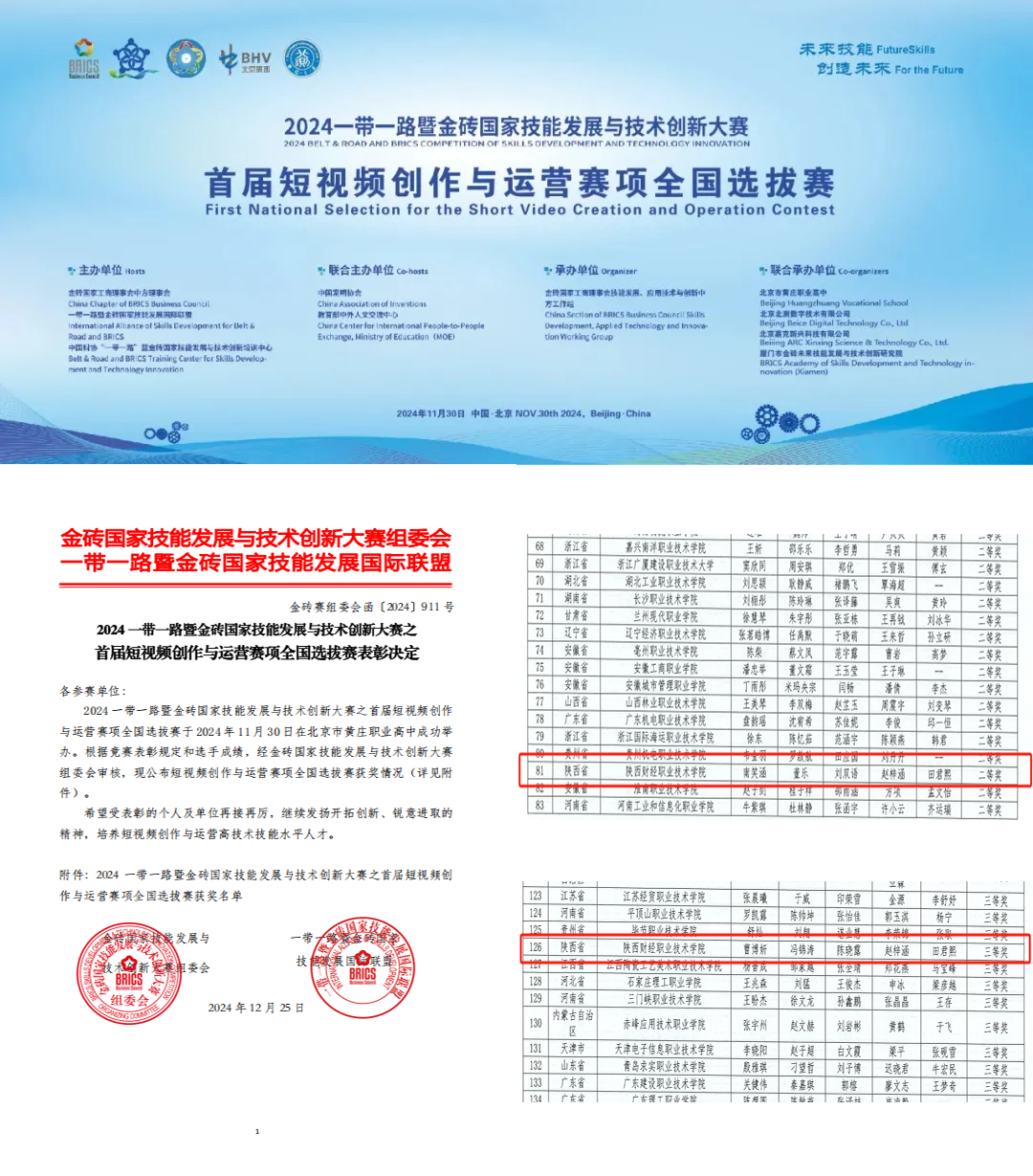 近日,2024第八届一带一路暨金砖国家技能发展与技术创新大赛各项赛事陆续举行。我校学子在首届短视频创作与运营赛项全国选拔赛中获得二等奖1项,三等奖1项;在第二届融媒体内容策划与制作赛项全国选拔赛中分别获得三等奖1项,优秀奖1项。