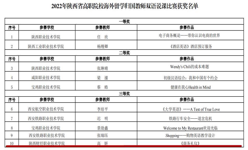 本次说课比赛共有包括我校在内全省14所高职院校,仅27名教师入围决赛。比赛通过线上线下相结合的方式进行,并诚邀西安交通大学、西安外国语大学等省内多所著名高校的英语、法语等5个语种10名专家教授担任评委,主要通过五个方面对参赛教师进行评分,包括教学理念、教学内容、教学创新、教学手段和教学效果。最终共评出一等奖2名、二等奖3名、三等奖5名、优秀奖17名。
