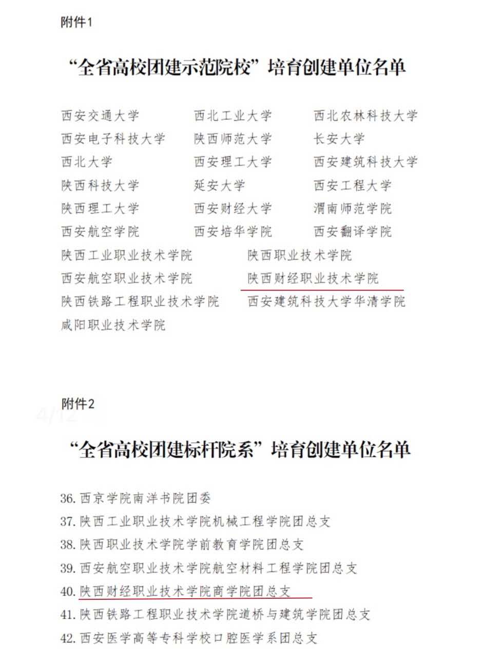 近日,共青团陕西省委、中共陕西省委教育工委联合下发《关于公布第一批全省高校团建示范院校、标杆院系、样板支部培育创建单位名单的通知》,我院入选“全省高校团建示范院校”培育创建单位,商学院团总支入选“全省高校团建标杆院系”培育创建单位。
