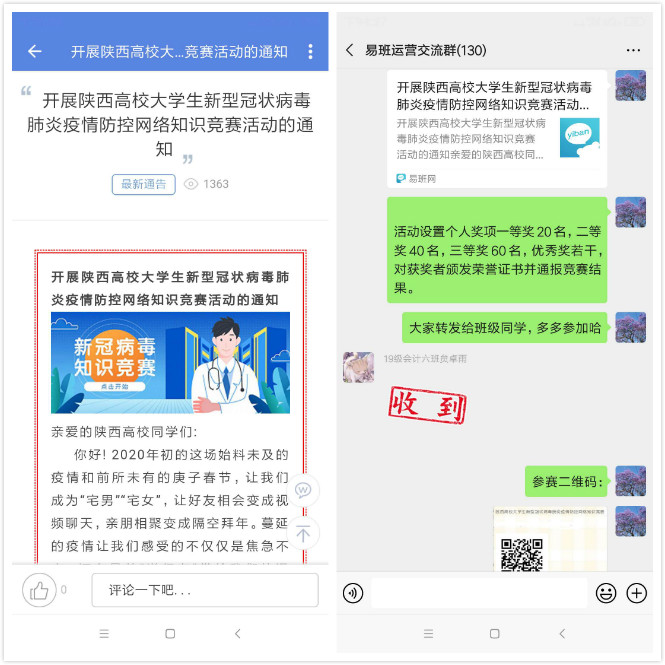 为了更好地响应教育系统疫情防控号召,引导高校学生进一步熟悉了解疫情防控知识,陕西高校网络思想政治工作中心、陕西省高校易班发展中心2月17日发布《开展陕西高校大学生新型冠状病毒肺炎疫情防控网络知识竞赛活动的通知》,接到通知后学院易班平台立即转载通知原文,并通过全院学管工作微信群、易班运营交流微信群向师生宣传,鼓励大家积极参赛。